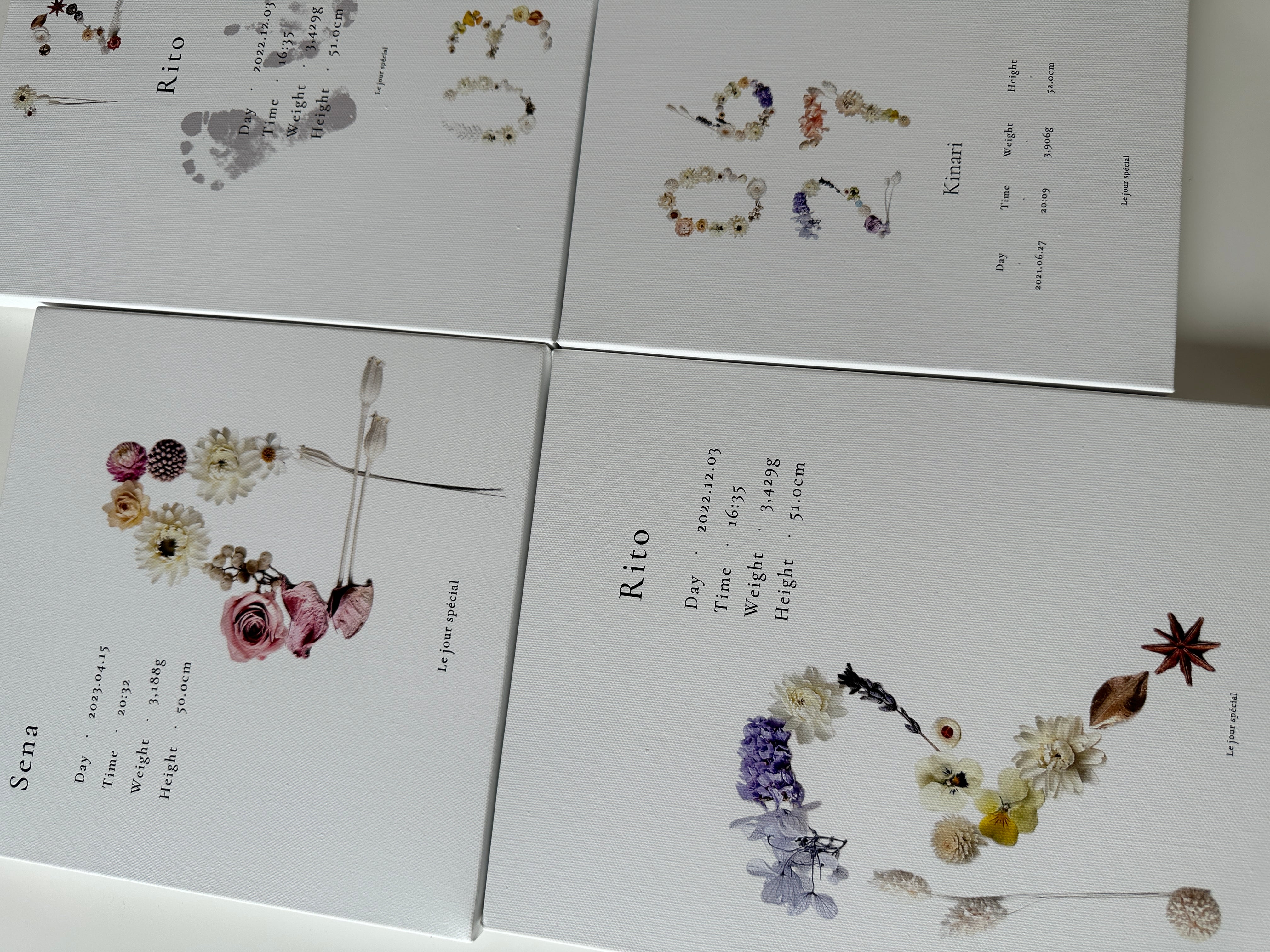 "ブリコラージュ" フランス語のブリコラージュ(Bricolage)は 「寄せ集める」「繕う」などの意味を持つ言葉です。 花を1つ1つ並べ、文字や数字を花で象ることを ljsでは「ブリコラージュ」と呼んでいます。 なぜ、わざわざ呼び名をつけたのか? 花咲く命名書は "単なる誕生日の贈りもの" でなく ちいさな命がある家庭にやってきたことを心から祝福するもの。 そのため、もっと「特別」で気分が華やぐ "記憶に残るプレゼント" にしたかったのです。 プリザーブドやドライの花をはじめ、葉、木の実など 様々なものを素材として構成し文字や数字を象ることを "作業" にするのではなく、何か呼び名をつけることで より愛情、愛着を持ってキャンバスボードの制作ができるのでは、と考えました。